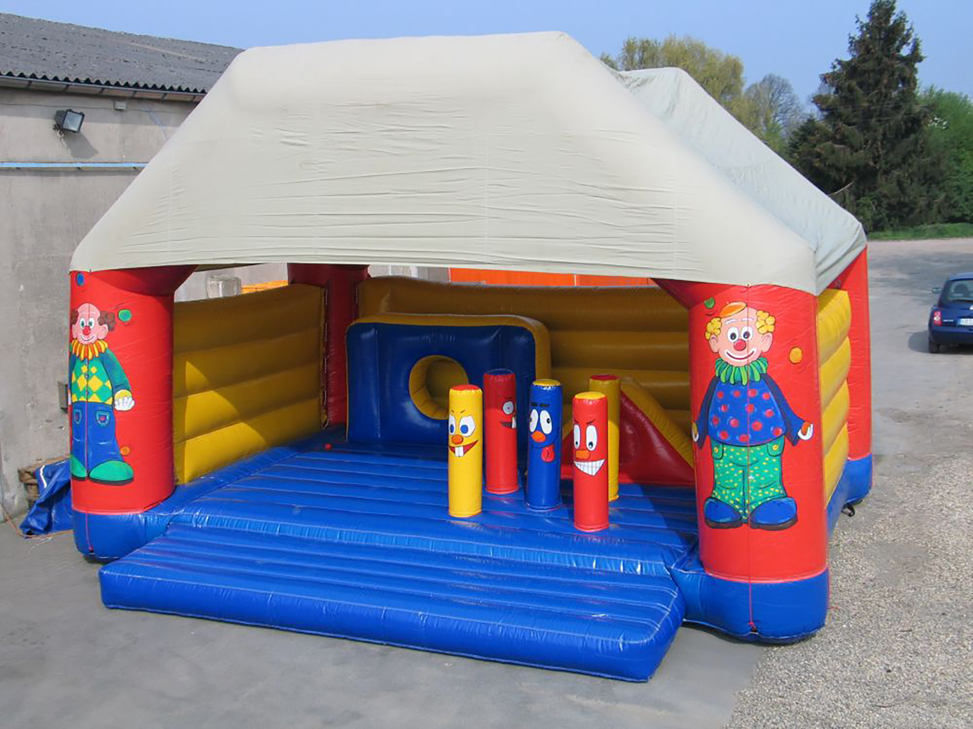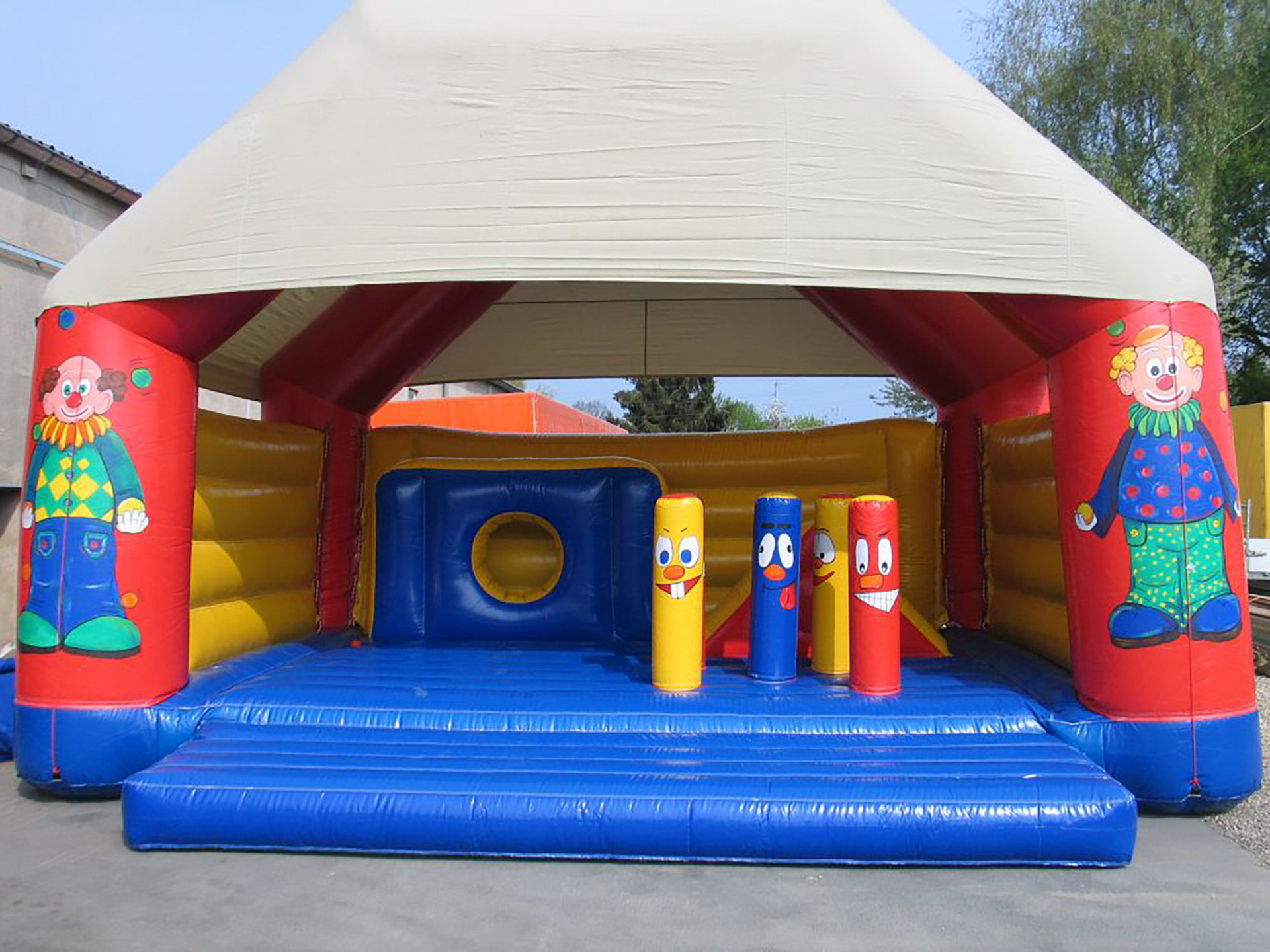Große Hüpfburg mit integrierten Spielelementen zum Slalom laufen, Klettern und Spielen. Überdacht! Passt toll zu Kinder-, Stadt- und Straßenfesten.