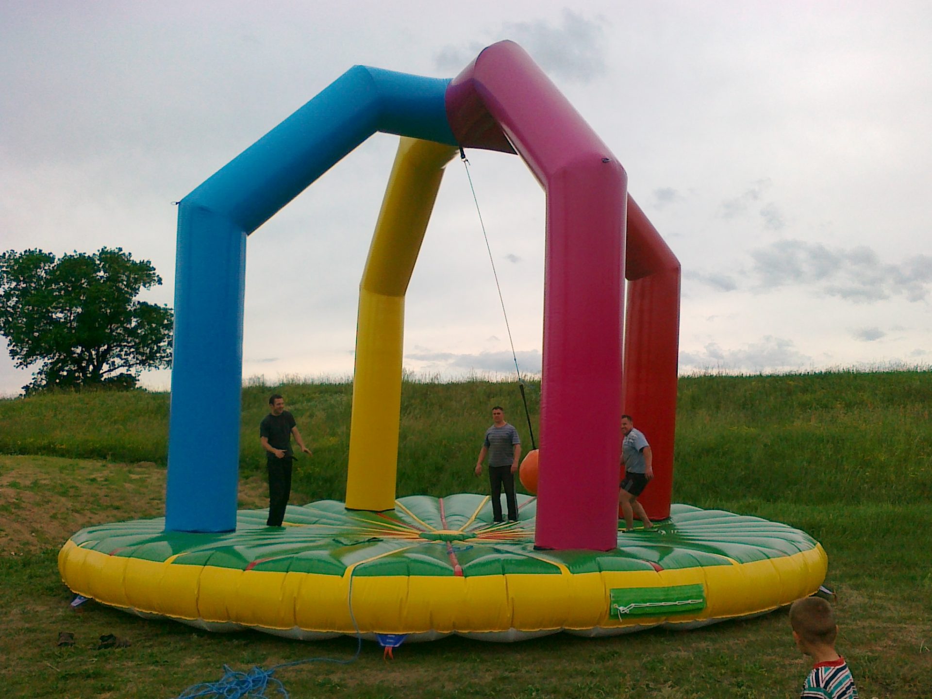 Swing`m off ist ein Aktionsspiel für max. 4 Teilnehmer. Ziel ist es, am längsten auf seinem Sockel stehen zu bleiben, während sich die Mitspieler, den in der Mitte an einem Seil befestigten Riesenball,  zu werfen.